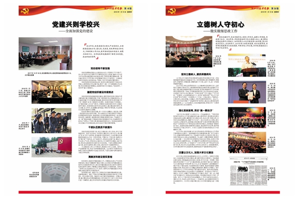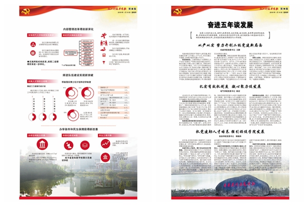《奋进》特刊系统回顾了校党委带领全校师生砥砺奋进的五年。其中,封面配发评论,鼓舞全校师生同心同德、改革创新、再创辉煌。2版对学校历次党代会进行回顾;3-8版图文并茂,系统梳理过去五年学校在党的建设、思政、人才培养、科研学科、国际合作等方面取得的喜人成绩;9-14版邀请二级党组织负责人畅谈5年来各基层党建实践探索与工作经验,15版介绍本次党代会筹备工作情况。封底号召全校师生为高水平建设社会主义的乐鱼体育平台中国有限公司,而努力奋斗!