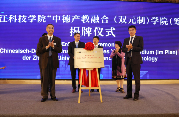 在欧珍、于永明、殷文等见证下,龚建立与德国北德学院董事克里斯托夫•费尔舍尔、博世汽车服务技术(苏州)有限公司总经理李秀峰共同为浙江科技学院“中德产教融合(双元制)学院(筹)”揭牌。