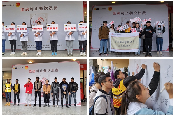 本次活动由纪检监察室、学工部、团委、资产经营公司、留学生中心主办,学生会承办。食堂的工作人员手持“光盘奖励”“小份菜专窗”“自选称重”等宣传标语展示了光盘行动的具体举措。学生代表宣读“光盘行动”倡议书,向全校同学发出“从现在做起,从自身做起,从节约粮食做起,争做勤俭节约的传承者、实践者和引领者。厉行勤俭节约,共建绿色校园!”的倡议。留学生代表用不同国家语言宣读“厉行节约,光盘行动”活动标语。诗朗诵《勤俭·节约》,呼吁大家培养勤俭节约的良好美德,让节约粮食形成一种新时尚、新潮流。活动中,全体到场人员共同演唱歌曲《我和我的祖国》,在对祖国崇高的致敬中,共同缅怀老一辈的开拓和节约精神。用餐高峰时段,同学来往就餐时可以看见与“坚决制止餐饮浪费”有关的宣传标语,增强了同学们节约粮食、珍惜粮食的意识。( 团委  学生记者  章韩璐、吴婕/文 余雁鸿/摄)