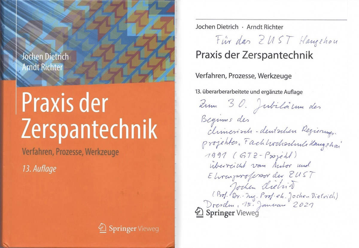 新学期伊始,我校名誉教授、德国德累斯顿技术经济大学教授约亨·迪特里希(Prof.Dr.-Ing. Jochen Dietrich)向我校邮寄捐赠其新出版的学术专著《切削加工技术实践(第13版)》,校长赵东福代表学校给迪特里希教授和德累斯顿技术经济大学回信。