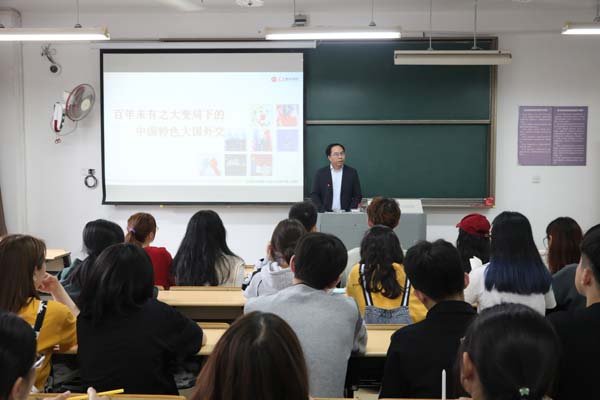 赵东福为表演专业,工商管理类专业本科生讲授《以百年未有之大变局下的中国特色大国外交》,他讲述了中国外交波澜壮阔的历史征程、中国新型外交面临的机遇和挑战、开创中国特色大国外交新局面。赵东福说,21世纪,人类正处在大发展大变革大调整时期,各国相互联系,相互依存,全球命运与共、休戚相关,中国共产党是志在为世界谋大同的党,是对人类命运负有重要责任的大国。中国新冠肺炎疫情防治过程中展现了大国道义和担当,值得我们为之骄傲、自豪,并激励学生们要把爱国之情转化为实际行动,做一个明大德、守公德、严私德的当代大学生,为实现中华民族伟大复兴中国梦而努力奋斗。