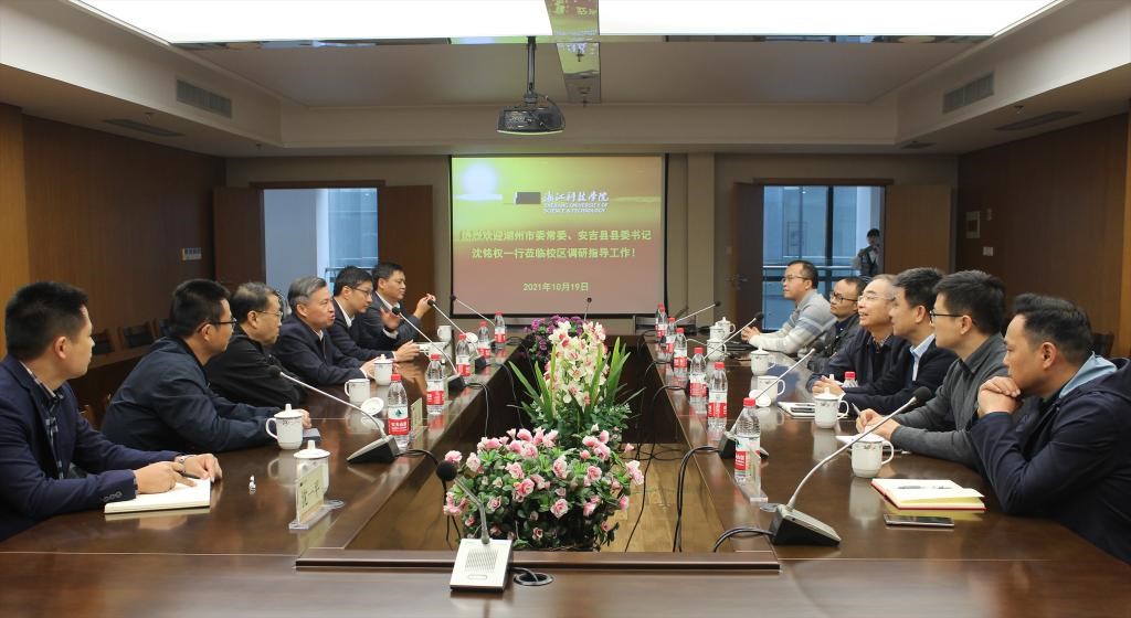10月19日,湖州市委常委、安吉县委书记沈铭权一行到安吉校区调研指导。校党委书记龚建立代表学校接待了沈铭权一行。