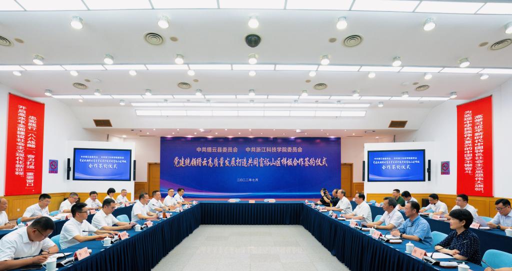 7月12日晚,党建统领缙云高质量发展打造共同富裕山区样板合作签约仪式举行,校党委书记赵东福、缙云县委书记王正飞出席会议。浙江科技学院党政领导班子,缙云县相关负责人参加。