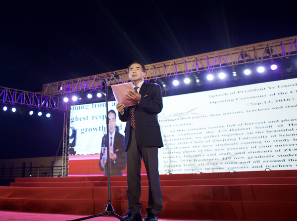 9月13号晚, 2016级新生开学典礼在安吉校区举行。校党政班子成员、安吉县委、县政府领导出席出席典礼。校党委副书记赵东福、2014本科生李寰同学主持典礼。