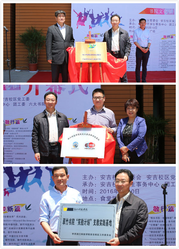 开幕式上,冯军与信息学院院长岑岗共同为劲竹书院“蓝色空间”科技实践基地揭牌。冯军与校友办主任王曦、安吉校友分会会长潘琳共同为怡竹书院“怡访谈”校友生涯导师访谈基地揭牌,并与梅园学校校长共同为“笑脸计划”支教实践基地揭牌。