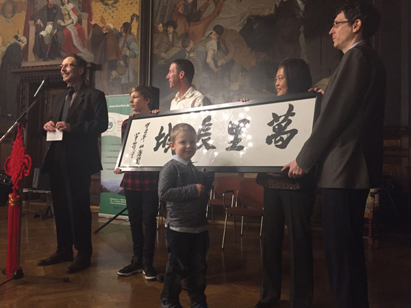 演出正式开始前,孔院德方代表向大家送上中国新年的祝福,并为德国观众介绍了春节这一中国最重要传统节日的由来、相关文化背景、习俗等。德国著名极限运动员、世界纪录保持者奎多·昆斯先生(Guido Kunze)向孔院捐赠了一幅中国长城专家书写的“万里长城”书法作品。