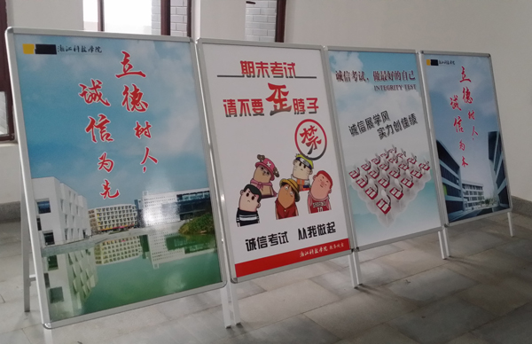 2014级新生入学,学校便将诚信教育摆在突出位置。安吉校区学生事务中心向全校学生发出了“以诚信考试为荣,以考试舞弊为耻”的倡议书,“诚信考试”签名活动得到众多同学响应,通过壁海报、横幅、微信平台广泛进行“诚信”宣传。在日前举行的学生学术诚信宣誓仪式上,近四千学生填写“诚信考场承诺书”。考试期间,考场内外张贴悬挂“既考成绩,更考人格”、“坚守心灵的诚信,提升人生的品位”等标语提醒同学。学校还出台措施,确保“诚信”在阳光下行走,保证参与同学的权利,也明确相应的处罚。