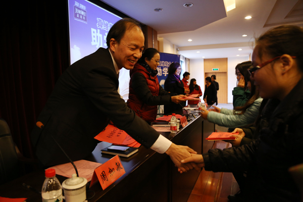 周加敏感谢真维斯长期为贫困学子提供物质资助、精神鼓励的义举,感谢省青少年发展基金会关注贫困生、帮扶其健康成长的善举。他期望受助学生要心存感激,学会感恩,积极向上,克服困难,把社会的资助化作今后继续努力学习的动力,在关注自身的同时,学会关注他人、关注社会,以优异的成绩报效国家、回报社会。