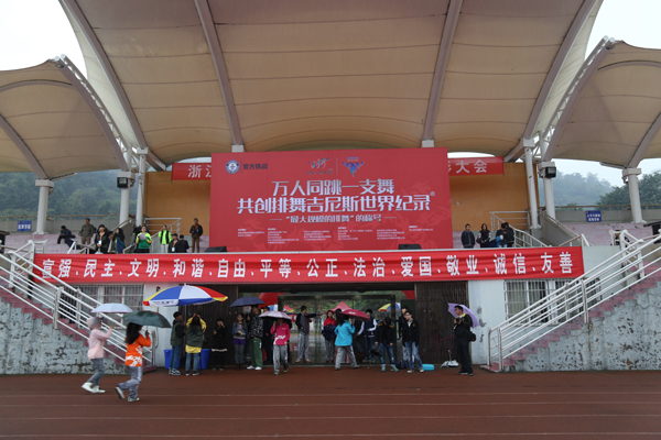 11月8日上午,1300余名师生冒雨参加了“万人同跳一支舞,共创排舞吉尼斯纪录”挑战。副校长冯军出席活动并致辞为师生加油,希望师生舞出青春、舞出时尚、舞出精彩。作为第十六届中国杭州西湖国际博览闭幕式重头节目,共有25703人在杭州滨江白马湖动漫广场和我校等18个分会场参与挑战。