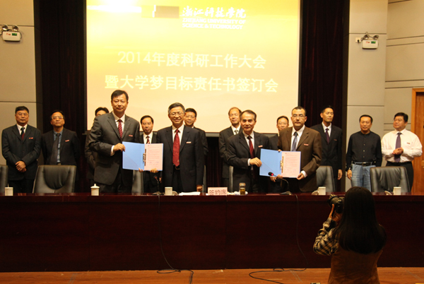 10月31日下午,学校召开2014年科研大会暨“大学梦”目标责任书签订大会。校党政领导班子成员出席会议。学校老领导代表,校学术委员会全体委员,全体中层干部,全体正高职称人员,博士,国家级项目负责人,省重大项目负责人,科研秘书等参加。会议由校长叶高翔主持。