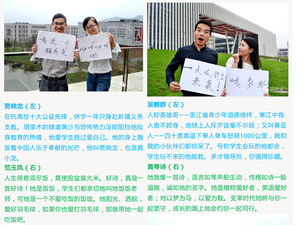 正如帖子开场白所言,“他们是学生学业的导师,生活的保姆,思想的舵手,感情的顾问,心理的咨询师……他们是新生入校见到的第一个老师,是困难时刻最常召唤的神龙,”辅导员对大学生而言是一个特殊群体,如何让2014级新生在入学前就熟悉自己的辅导员,安吉学生事务中心煞费心机,想出了微信“造势”这一适应95后大学生特点的招数。中心主任蒋邢飞老师说:“这次希望以年轻人喜闻乐见的方式告诉新生:科院在等你,安吉校区在等你,辅导员在等你!”新生辅导员团队仅花了一天时间就完成了照片中的拍摄地点选择、卖萌动作设计、诙谐语言创意及摄影等一系列工作。辅导员郭增勇老师用一句话解释他们高效战斗力的原因:“我们充满朝气,每个人各有所长并且相互配合。”