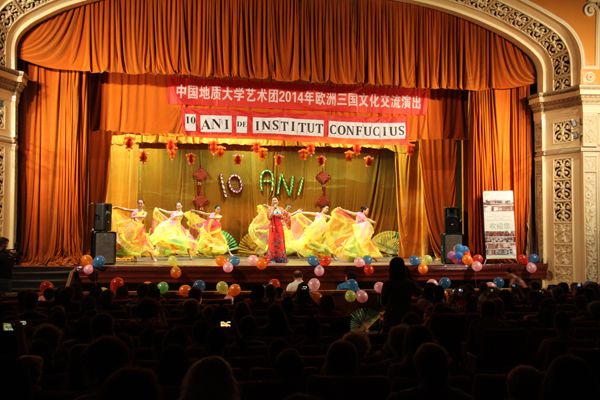 中国地质大学艺术团此次受国家汉办派遣,参与在罗马尼亚举办的孔子学院建院十周年系列巡演活动演出。胡内多阿拉市市长Avion先生在演出前致词中说:“去年在克鲁日孔子学院的帮助下,我们建立了孔子课堂,从此为我们了解中国文化开启了一扇窗口。今年是中罗建交六十五周年,中国的艺术团体第一次到胡内多阿拉进行演出。在这里感谢孔子学院,感谢从中国到来的朋友。”