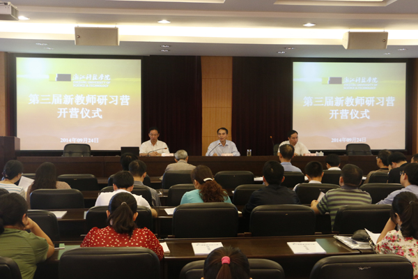 9月24日下午,校第三届新教师研习营开营,校长叶高翔,副校长赵东福出席,副校长冯军主持开营仪式。相关职能部门负责人,相关学院教师发展工作负责人、联系人、人事秘书,2014年以来新引进教师和2014年参加助讲培养的青年教师等100余人参加。