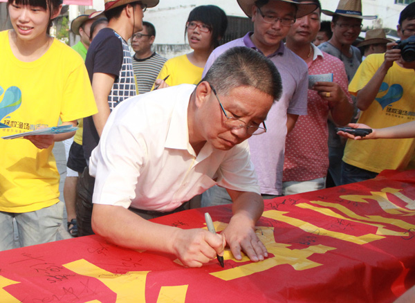 图1为黄旭明在“保护东海,人人有责”倡议横幅上签名