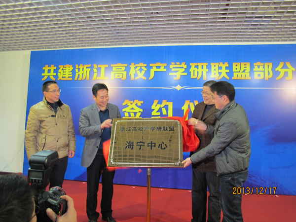 汪晓村、柴永强、郑友取和海宁省级高新技术产业园区管委会副主任高永强为浙江高校产学研联盟海宁中心揭牌。