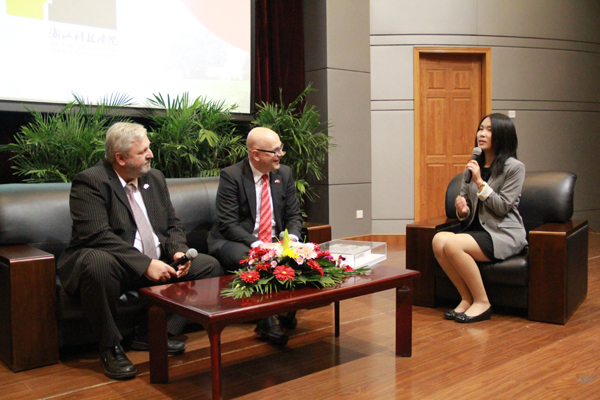 欢迎仪式后,阿尔比希和利兹与我校学生进行了互动交流,话题涉及石荷州与浙江省在教育、文化、经贸方面的合作,石荷州的绿色新能源技术,中国留学生在石荷州高校的学习和生活等,气氛十分融洽。