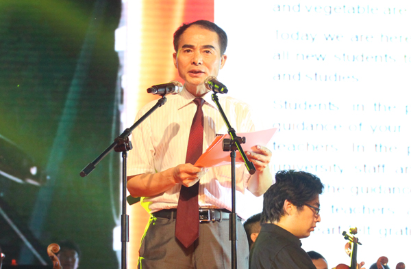 校党政领导班子成员及校长助理出席典礼并共同为新生佩戴校徽。四千名新生和来自50多个国家的留学生,根据专业性质身着蓝、黄、粉三色T恤成三大阵营坐于台下。典礼由校党委副书记周加敏和经管学院11级郑百何同学一同主持。