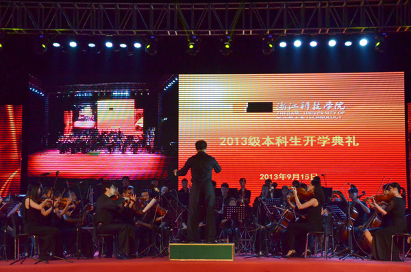 9月15日晚6时30分,在交响乐团激情昂扬的《红旗颂》中,2013级新生开学典礼拉开帷幕。和山之巅,4000余名新生放飞梦想,西蜜湖畔,他们扬帆起航。