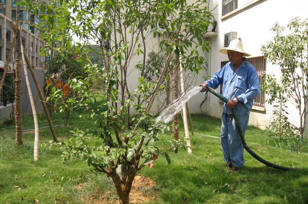 今年暑期杭州连续高温,为让校园绿化保持最好状态,后勤公司物管中心杂项绿化组员工调整了工作时间,除做好日常绿化养护工作外,工作重点就是避开高温时段全力对校区绿化植物进行浇水灌溉,特别是对新植树木进行全面浇水,浇足浇透,还对对银杏广场的两株旱情特别严重的银杏树苗进行了遮荫保护。师生返校能看到校园绿色依旧,风景更靓。
