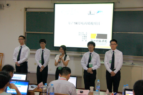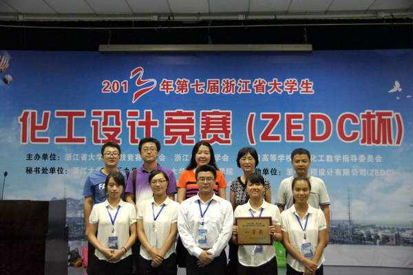 在浙江省化工设计竞赛中,经初赛选拔,来自浙江大学、浙江工业大学和我校等24所高校的32支队伍参加决赛。由我校生化学院成忠、盖希坤、曾翎、杨瑞芹、康明老师联合指导,10级化工专业赵芳芳、陈凯、严梦园、潘玉露和10级物流专业陈娜同学组合的“one得four”团队,通过完整而富有创新的设计方案、流畅的解说及答辩,引起了评委对设计项目的浓厚兴趣,最终获得一等奖。这也是我校学生在浙江省化工类“A”类学科竞赛中斩获的最佳战绩。