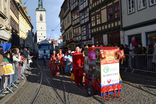 当地时间2月10日,一年一度埃尔福特市最为声势浩大的狂欢节游行活动——第38届狂欢节大游行在埃尔福特市大教堂广场拉开帷幕。埃尔福特孔院特意组织了一支由17人组成的具有中国传统特色的游行队伍首次参加活动。这支身着五彩缤纷民族服饰的方阵是57支队伍中唯一一支外国人参加的队伍,成为今年游行活动的最大亮点之一。游行队伍经过了埃尔福特的大街小巷和著名的安德里斯大街,最后又回到大教堂广场,活动持续了近4个小时。据当地媒体报道,当天共有8万多名观众观看了此次游行。
