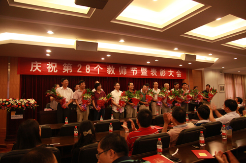 校党委副书记周加敏宣读从教三十年教师,省级以上先进个人,省、校“三育人”先进集体、先进个人,科院青年英才、优秀主讲教师名单。出席会议的校领导为受表彰的集体、个人颁奖。