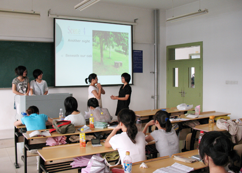 图为《高级英语》课堂上学生以小组进行陈述