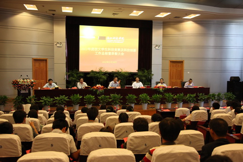 教务处负责人作2011年度大学生科技竞赛及科技创新工作总结报告。获表彰集体和教师代表、学生代表在会上作交流发言。