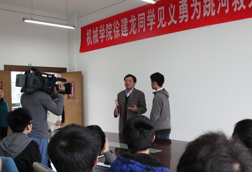 近日,校长杜卫向机械学院大四学生徐建龙颁发了学校特别荣誉奖学金,奖励徐建龙勇救跳河女子的义举。收到荣誉证书和奖金后的徐建龙当即决定把5000元奖金捐给云南宁蒗爱心毅行“土豆计划”,资助宁蒗贫困山区的孩子完成学业。