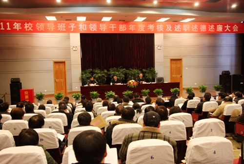 1月13日,学校召开2011年度校领导班子和领导干部考核及述职述德述廉大会。校党政领导班子成员和省委组织部干部三处副处长叶志航,省委教育工委干部处副调研员王永芬、省教育纪工委干部杨丽娜等出席会议。会议由校党委书记王建华主持。全体中层干部、教代会执委会成员、正高职称人员、各民主党派负责人、近三年退下来的校级领导干部等参加了会议。