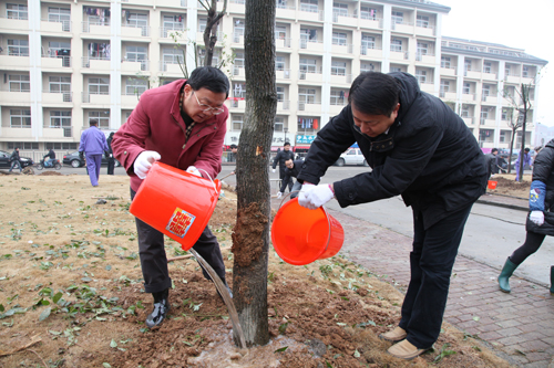 上午9时许,两级领导等一百余人来到东和公寓,他们自发地组成植树小组,合力把树苗移入坑中,移正竖直,再用铁锹培土、夯实。不一会儿,沿着大草坪栽下一棵棵行道树苗,也种下一份份希望。有的干部记下自己植树的位置,说“20年后再来看看这些树是很有意义的”。大伙儿干得热火朝天,一个多小时,在欢声笑语中种下了56棵碗口粗的香樟树苗。据悉,东和公寓是今年学校绿化的重点,植树节前后还将种下一批树苗。