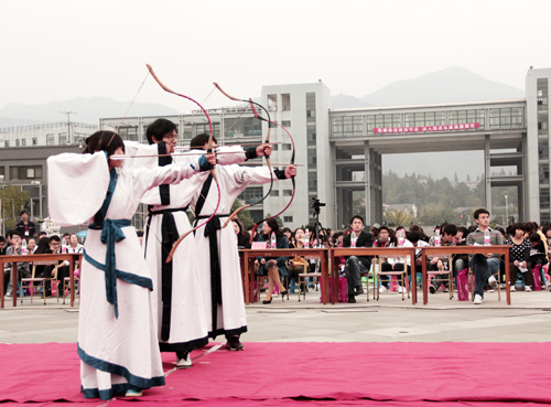 一曲优美的琵琶现场独奏《高山流水》拉开了活动序幕。今年孔子文化节的主题是射礼。射礼是古代一种非常重要的礼仪,学生们现场演示,部分再现了古代射礼的面貌。整个射礼分为开礼、比耦、诱射、一番射、二番射、三番射。射手身着汉服,依次而射,既果断勇武,又举止文雅,把射与礼、武和文很好的结合了起来,博得了现场观众的阵阵热烈掌声。