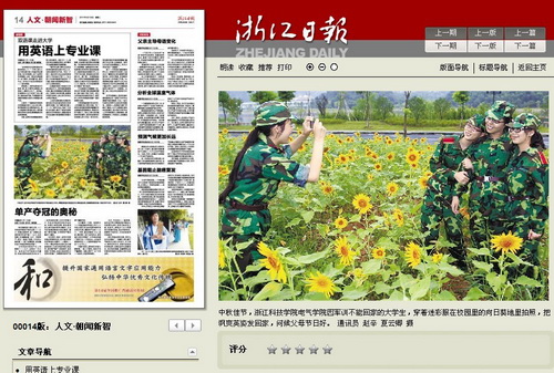 这两天,不少军训新生三五成群来到向日葵地,西蜜湖畔,与向日葵、白鹭合影,把自己的飒爽英姿和学校美景发回家。浙江日报对这一活动作了报道(http://zjdaily.zjol.com.cn/html/2011-09/13/content_1082541.htm?div=0)。