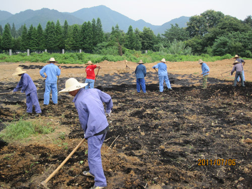 早在五月初,后勤公司相关人员就到余杭薰衣草园考察。经交流及实地考察,公司决定在和水路地块试种一部分薰衣草、马鞭草。薰衣草、马鞭草是一种对生长环境要求很高的植物,为保证成活率,根据园场主的意见,在场地平整后,物管中心对试种区域专门进行了土壤改良,并挖掘了排水沟。