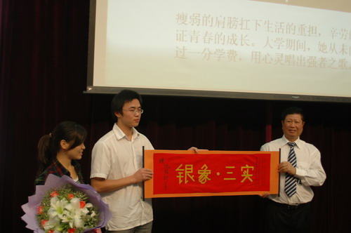 毛建卫对银象公司热心教育事业、关心和帮助我校同学的善举表示感谢。获奖同学代表还向沈颜新献上了鲜花和他们全体亲手制作的纪念品——绣有“银象•三实”的十字绣。
