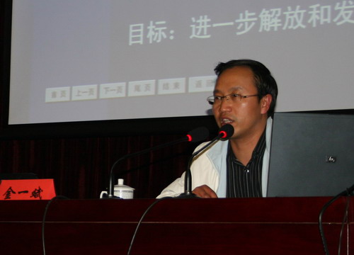 3月21日下午,学习贯彻十七大精神集中培训进行第三场辅导报告,杭州电子科技大学党委副书记金一斌作了题为“发挥高校优势,服务‘两创’战略”的报告。校党委副书记胡浙平主持报告会。