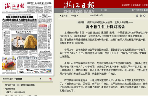 高个新生住上特别宿舍——浙江日报头版报道我校关怀学生的举措
