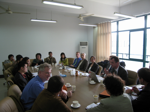 选拔期间,国际交流合作处会同中德学院、机械学院、电气学院、艺术学院、生化学院等二级学院积极与汉诺威应用科学大学代表就“2+3”中德联合培养本科生项目进行了深入交流。中德双方分别就学生专业知识、外语能力、综合素质等方面交换了意见。德方负责人表示,我校今年“2+3”项目学生素质明显好于往年,学生语言、专业能力都有了很大提高。德方建议,我校在学生的培养过程中可以关注三个环节:一要加强对学生专业兴趣的培养,特别是要加强专业知识背景、专业素养、专业发展方向等方面的培养;二要在德语教学过程中注重专业知识的渗透、学生综合能力的培养;三要积极培育学生的沟通交流能力,加强学生动手能力,使学生到德国后尽快适应学习、生活环境。