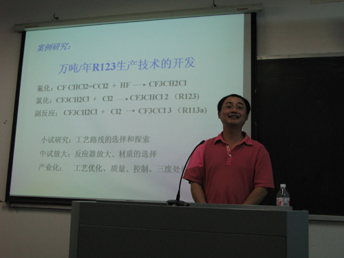 联合国环境发展署(UNEP)制冷技术选择委员会中国委员、国家ODS替代品工程技术研究中心办公室主任、国家履行禁止化学武器公约工作领导小组办公室外聘技术专家、浙江蓝天环保高科技股份有限公司副总工程师、研发部经理、浙江省化工研究院ODS替代品研究所副所长张建君教授级高工为我校学生作了题为“国内外ODS替代品研究开发新进展”的课程讲座。他从大家关心的臭氧层空洞形成和对人类危害谈起,通过亲身经历的我国ODS替代品研制过程及在国外及国际会议场合经历的案例,向同学们介绍了化学工程实验室过程、中试放大过程和产业化过程等全方位研发历程,进一步增强了理论知识的感性认识。