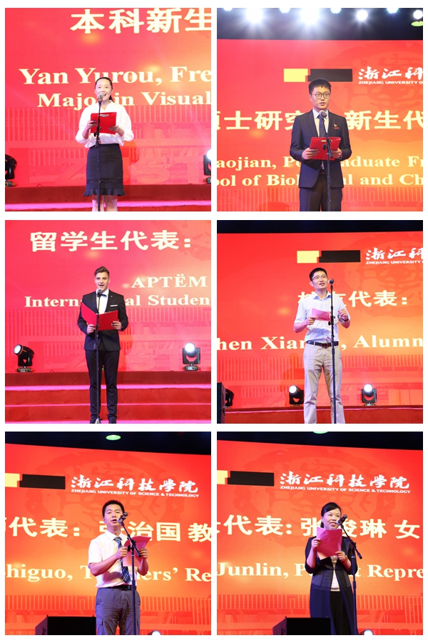 本科新生代表鄢羽柔,研究生新生代表王高坚和老生代表、俄罗斯籍留学生乔马分别上台发言,展望未来、畅谈体会,希望在浙科共同收获精彩人生。