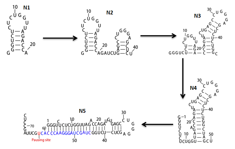 该工作揭示了停顿事件与转录速度相互作用对RNA共转录折叠动力学控制的策略,给出了E.coli SRP RNA和HIV-1 TAR RNA的主要折叠路径,以及预测了HIV-1 TAR RNA可能存在的停顿点。通过研究发现,不同的RNA在共转录折叠时对转录速度有不同的偏好。例如117-nucleotide E.coli SRP RNA在较高的转录速度下不利于Native structure结构的形成,但通过转录停顿事件,能挽救Native structure结构的形成。结果表明:停顿事件与转录速度形成互补事件,共同促进RNA共转录折叠,以保证RNA转录折叠为正确的RNA结构,促进生物细胞完成其正常的生理功能。该工作为RNA共转录折叠动力学提供了一套理论基础,同时揭示了停顿对RNA共转录折叠的重要影响。(理学院 黄 喆)