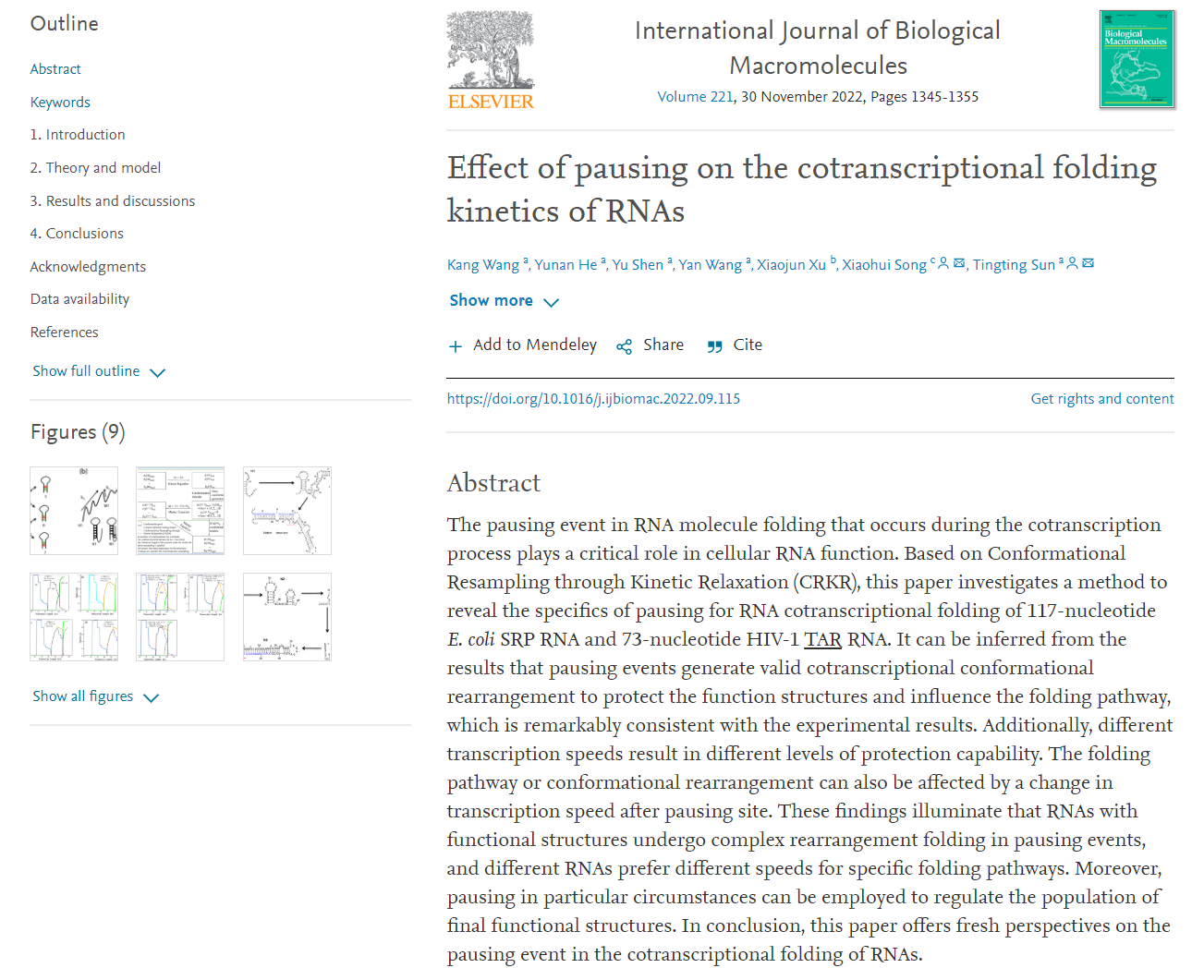 近日,理学院应用物理系孙婷婷教授团队在RNA共转录折叠动力学的研究方面取得重要进展,并在《International Journal of Biological Macromolecules》(中科院一区TOP期刊,IF:8.023)上发表了题为“Effect of pausing on the cotranscriptional folding kinetics of RNAs”的研究论文(点击阅读论文)。该论文以浙江科技学院为第一署名单位,应用物理系21级硕士研究生王康为第一作者,孙婷婷教授为论文通讯作者。