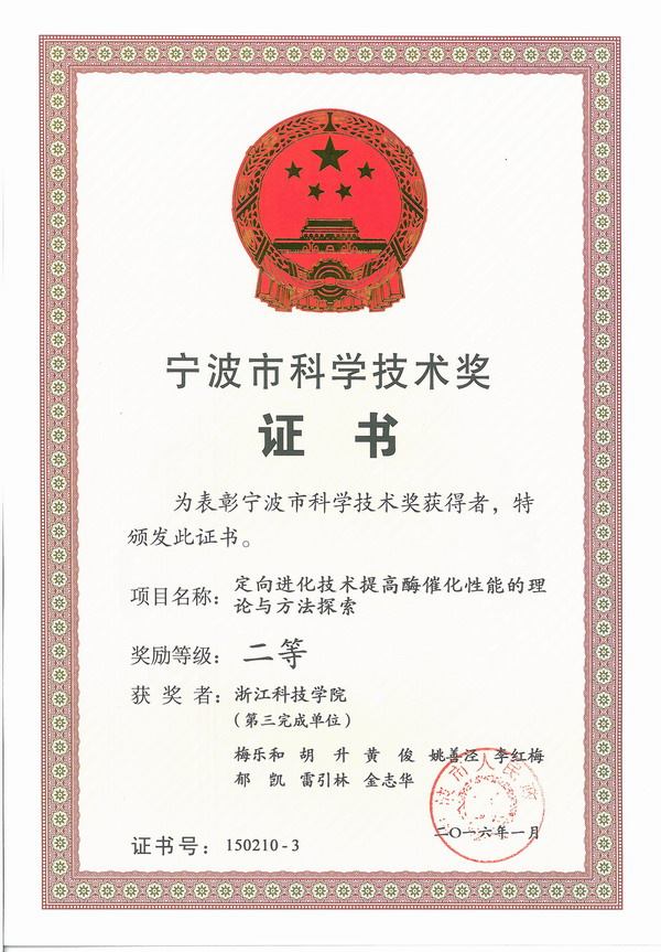 日前,由我院黄俊教授参与的“定向进化技术提高酶催化性能的理论与方法探索”获得宁波市科技进步二等奖。生物催化技术作为新一代物质加工模式,具有催化效率高、选择性强、反应条件温和、环境友好等优势,已成为化学工业绿色制造不可或缺的重要工具。酶是生物催化的核心要素,采用合适的方法对酶的分子结构进行恰当的修饰或改造,使其催化选择性、催化活力、稳定性等关键性质满足实际应用的需要,一直是该研究的核心内容。本项目以探索酶分子高效改造的理论和方法为研究目的,选用两种具有重要应用价值的酶:细胞色素P450 BM-3和谷氨酸脱羧酶(GAD)作为研究对象,运用定向进化技术对其进行改造和设计,通过酶学性质表征、同源建模、分子动力学模拟等技术探讨了突变位点与酶结构、酶催化活性及其稳定性之间的内在关系,加深了对P450 BM-3和GAD结构-功能关系的理解,推动了酶工程研究理论的发展。本研究获得授权中国发明专利8项,发表学术论文20 篇(其中SCI/EI论文17 篇),研究成果得到了国内外同行的高度关注,论文被Chemical Reviews、AngewandteChemie-International Edition、PNAS、Critical Reviews in Biotechnology、Current Opinion in Chemical Biology、Current Opinion in Microbiology、Biotechnology and Bioengineering等顶级及TOP期刊论文他引100余次,得到了国内外同行的积极评价,研究成果为酶分子的改造提供了有益的理论指导和方法借鉴,产生了广泛的学术影响。