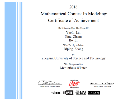 4月12日,从美国大学生数学建模竞赛与交叉学科数学建模竞赛(MCM/ICM)网站传来喜报,由理学院的来越富(15信计)、经管学院的张凝(14财管)、信息学院的李博(14物联网)同学组成的代表队(指导教师:章迪平)获得国际一等奖(Meritorious Winner);另一支由理学院的王树一(14信计)、毛珂瑞(14信计)、毛冬媛(14应用物理)同学组成的代表队(指导教师:李蔚)获得国际三等奖(Successful Participant)。